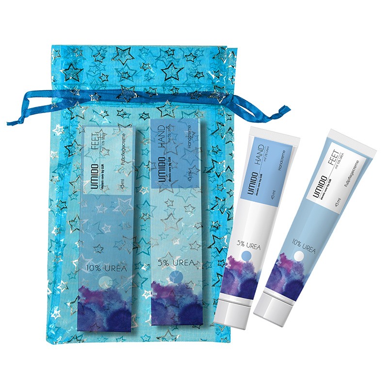 UMIDO Beautyset 1 x 45 ml Fußcreme 10 % Urea und 1 x 45 ml Hand-Lotion 5 % Urea im blauen Organza-Säckchen, regenerierendes Fuß-Balsam, Feuchtigkeitspflege für trockene und spröde Haut, Fuß-Lotion sofort einziehend, Pflege-Creme für gesunde Füße, für eine tägliche Fußpflege, Handcreme bei trockener Haut, Feuchtigkeitspflege ohne zu fetten, Lotion sofort einziehend, Pflege-Creme für zarte Hände, für eine tägliche Hautpflege |